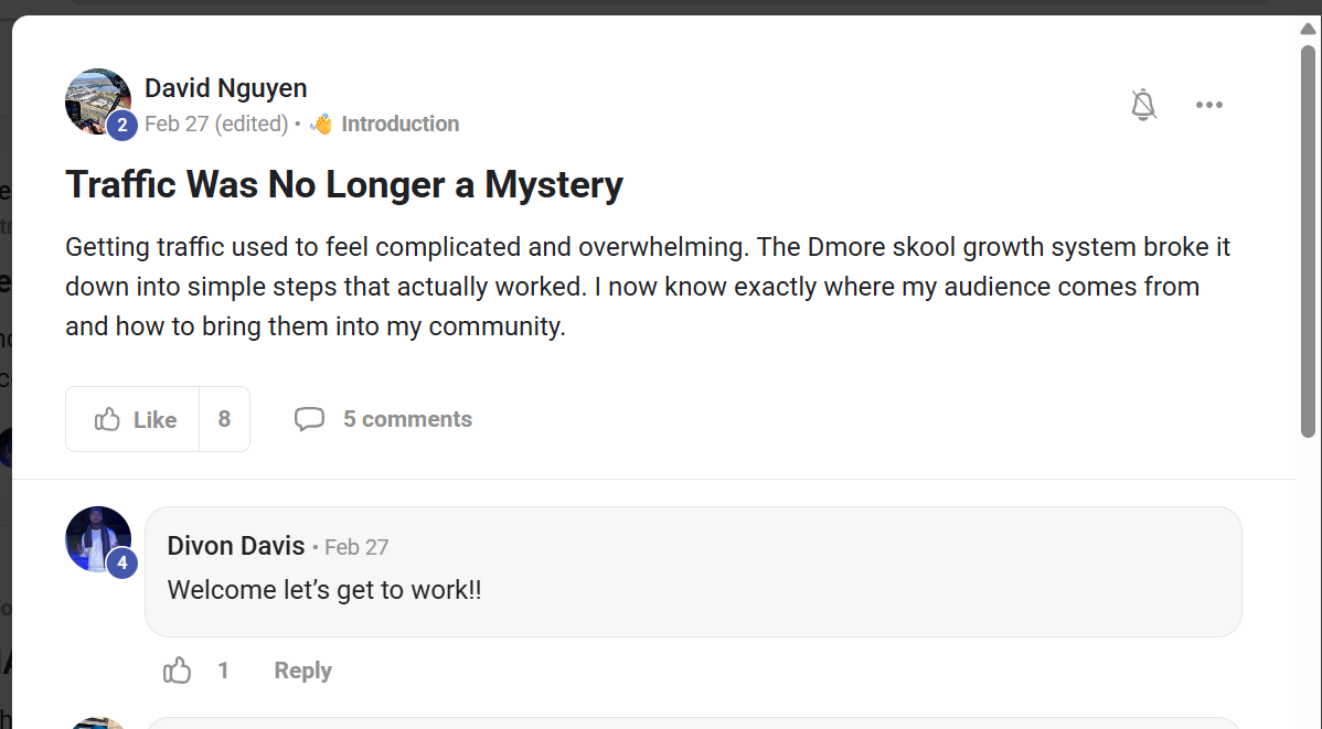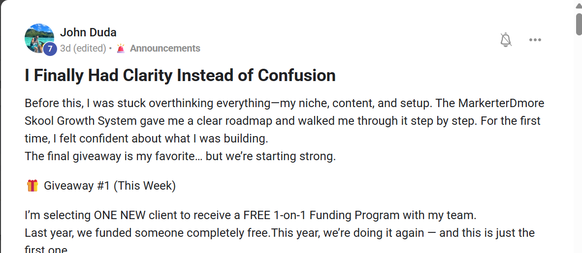 A lot of new Skool creators share the same experience. You join Skool feeling excited. You see other communities growing quickly. You imagine building a thriving group of your own. Then it’s time to actually build. And everything stalls. What niche should you choose? How should your classroom be structured? What content should you post? How do you attract members? And what if no one joins? Soon, you’re staring at a blank screen, scrolling through other people’s communities, and trying random strategies that only create more confusion. You’re not stuck because you lack ability. You’re stuck because no one has given you a clear, beginner- friendly roadmap. That’s exactly where the MarkerterDmore Skool Growth System comes in for you.
